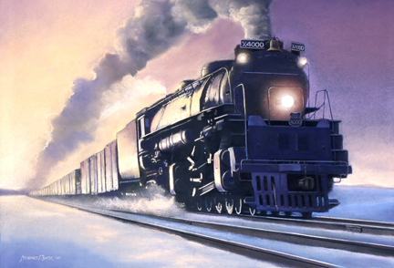 light of early dawn, a monstrous Union Pacific 4-8-8-4 thunders